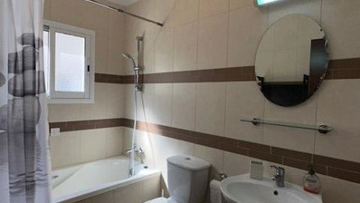 A comfortable furnished apartment is available for rent in the Potamos Germasogeias area, located within a gated complex featuring a communal swimming pool. The apartment includes two bedrooms, a family bathroom, and an open-plan kitchen, dining, and living area that opens onto a balcony.